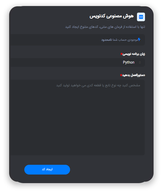با استفاده از زبان انسانی خود برای توضیح نیازهایتان، الگوریتمها و کدهای برنامه نویسی پیچیده را به سادگی تولید کنید، ما بقیه کارها را برای شما انجام میدهیم. مانند یک حرفهای کدنویسی را در زبانهای برنامهنویسی مثل پایتون، فلاتر، پیاچپی، جاوااسکریپت، روبی و سایر زبانهای برنامهنویسی انجام دهید